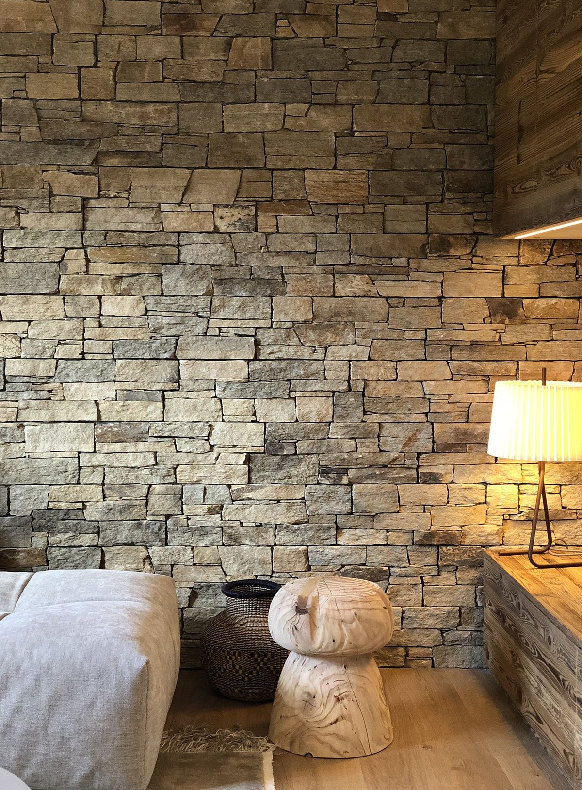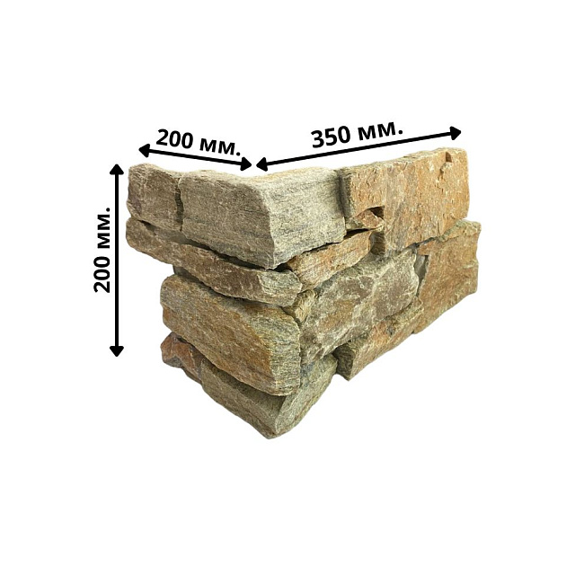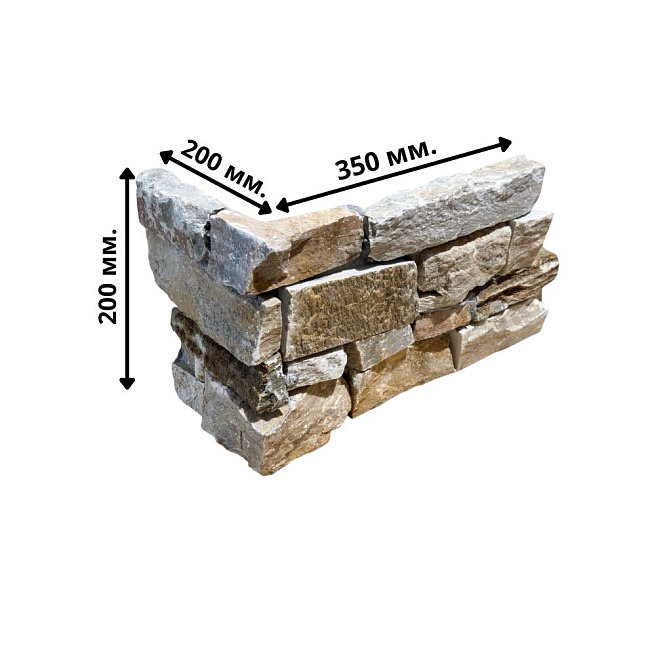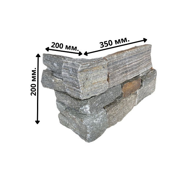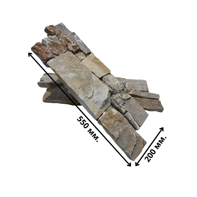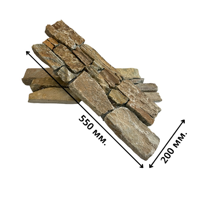 Камень продается готовыми панелями, состоящими из склеенных кусочков камня. С задней стороны укреплены сеткой. Размеры панели 550 х 200 х 20-40 мм. Имеет выраженный 3D эффект, в массе создает красивую фактурную поверхность. Кварцит серо-коричневый используется для внутренней и внешней отделки.