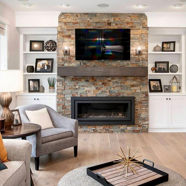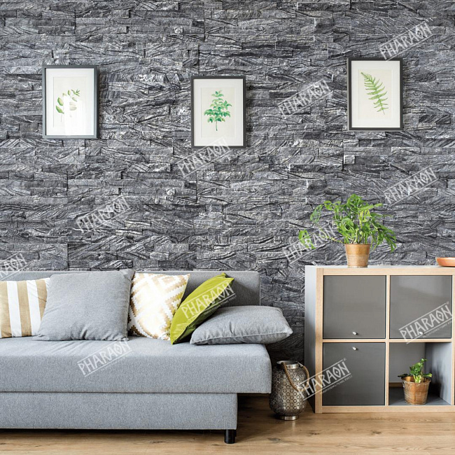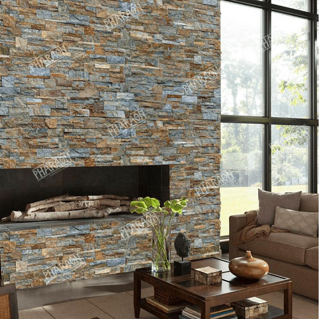 Камень продается готовыми панелями, состоящими из склеенных кусочков камня. Размеры панели 600 х 150 х 10-20 мм. Имеет выраженный 3D эффект, в массе создает красивую фактурную поверхность и придает объем пространству. Сланец мультиколор используется для внутренней и внешней отделки.