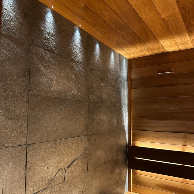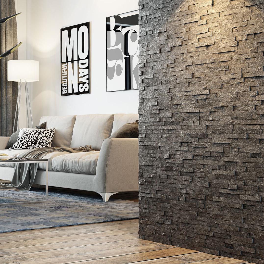 Камень продается готовыми панелями, состоящими из склеенных кусочков камня. 3d панели коллекции "Неоклассик" имеют геометрический выступ, что обеспечивает лучшую стыковку и скрытие вертикального шва. Размеры панелей 600 х 150 х 10-25 мм. Имеют выраженный 3D эффект, в массе создают красивую фактурную поверхность и придают объем пространству. Кварцит черный используется для внутренней и внешней отделки. Обладает умеренным природным блеском.