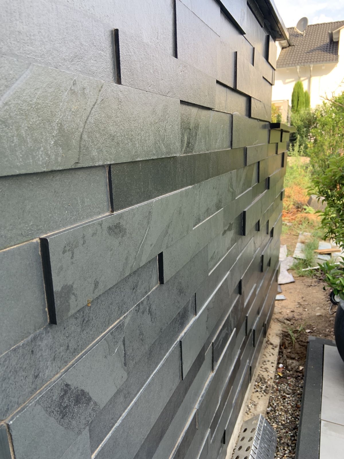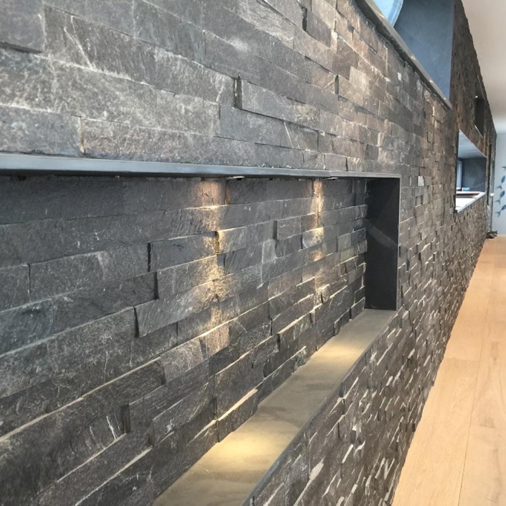Плитка из натурального камня продается коробками по 20 шт (0,42 м2). Размер плитки 300x70x10-20 мм. За счет разной толщины плитки (от 10 до 20 мм.) создается выразительный 3D эффект, имеет природный скол на поверхности. Сланец черный используется для внутренней и внешней отделки.